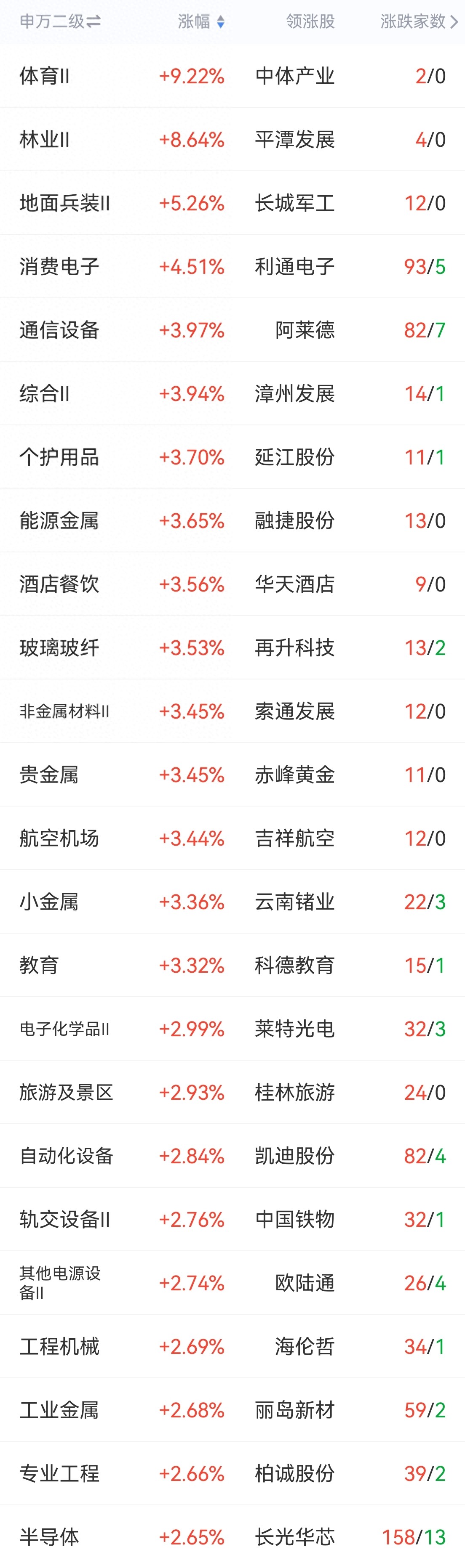 涨幅居前板块传统产业中的体育教育、林业、综合、酒店餐饮旅游、个护、有色和贵金属、能源金属和小金属、玻纤、非金属材料、交通运输、专业工程和工作机械、电源设备等,热点中的国防军工(兵装)、消费电子、通信设备、半导体芯片、智能制造(自动化设备)等涨幅居前。