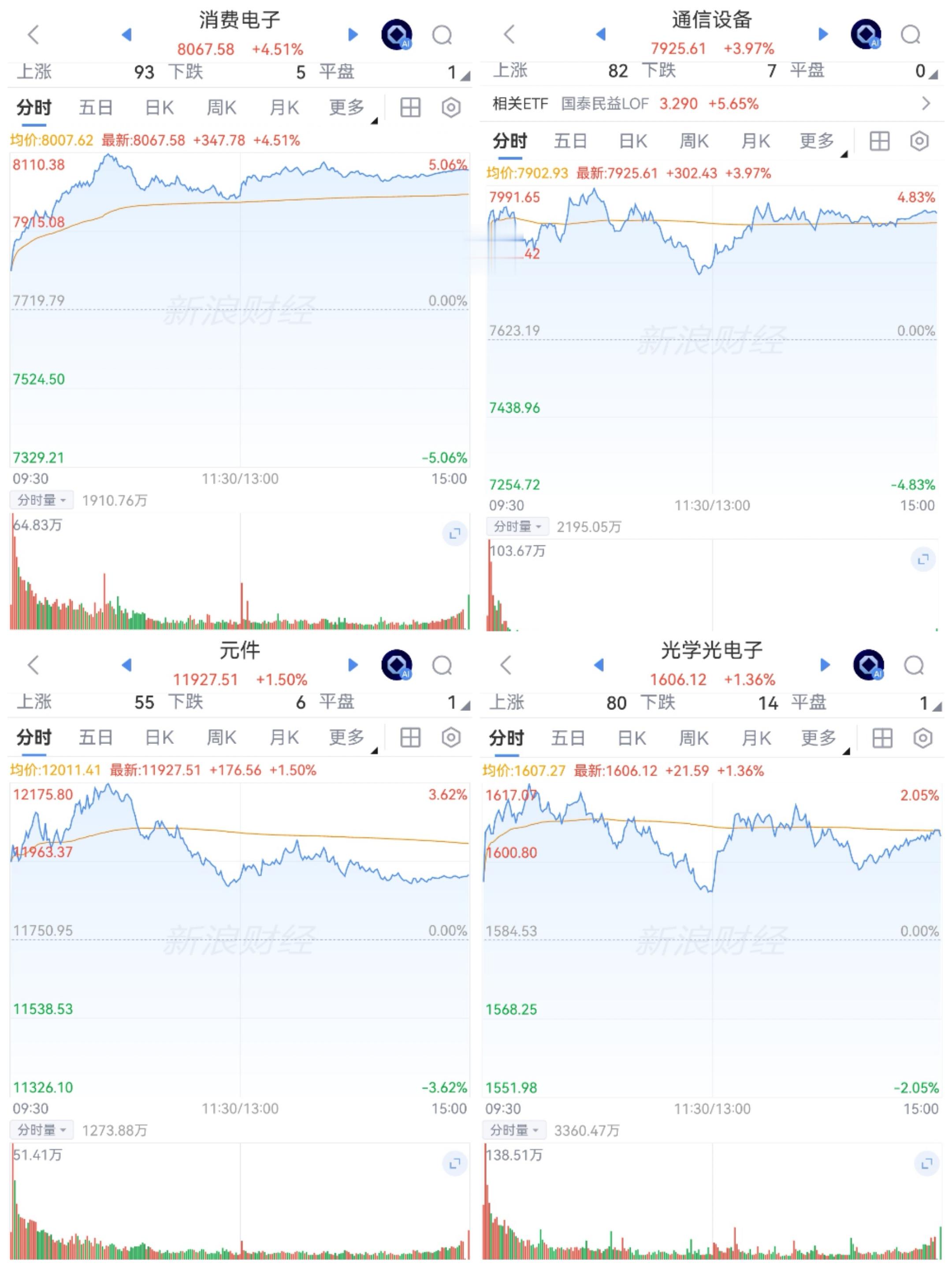 5G和消费电子震荡分化。板块半数净买入。通信设备、元件新高附近震荡;消费电子、光电子又冲向下方的250日均线。