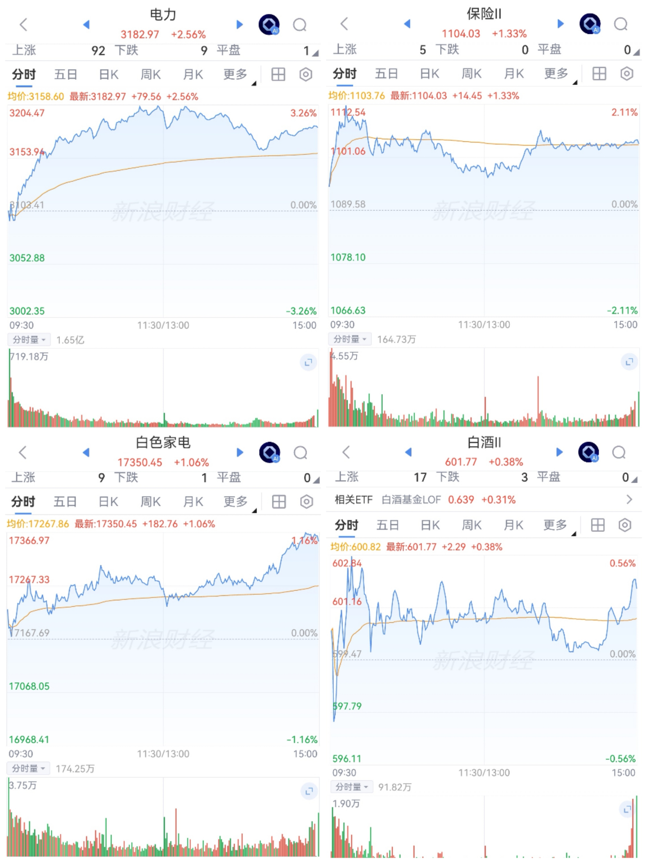 部分红利,开盘拉升又震荡,电力涨幅可观,保险家电涨幅较明显,白酒微红电信微绿;化石能源低开低位震荡全天,油气大跌,炼化跌幅可观,煤炭跌幅较明显。