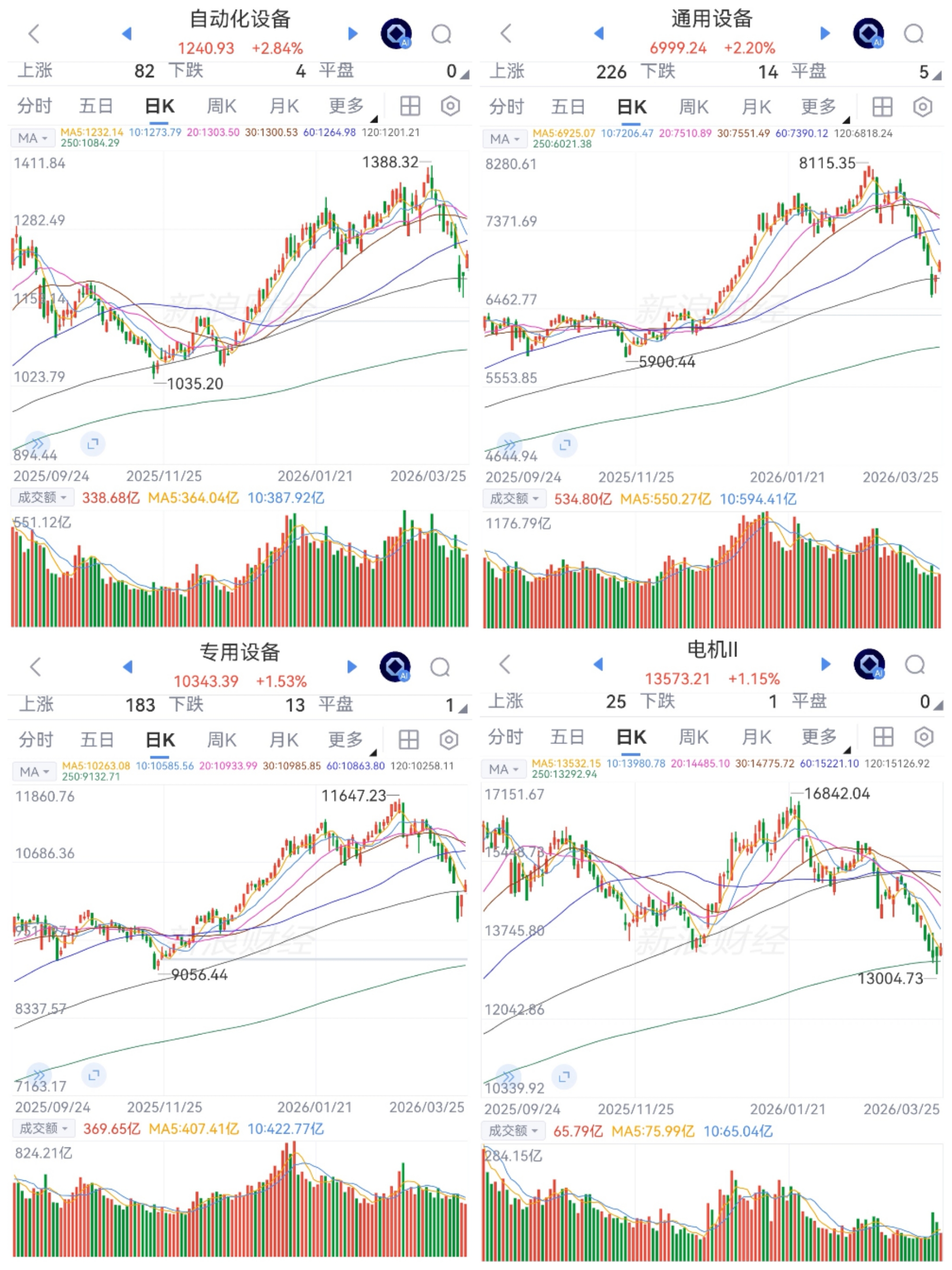 智能制造震荡反弹。板块多数净买入。自动化、通用和专用连创新高后回调,120日均线附近,电机接近前高后大幅回调跌至250日均线上方。