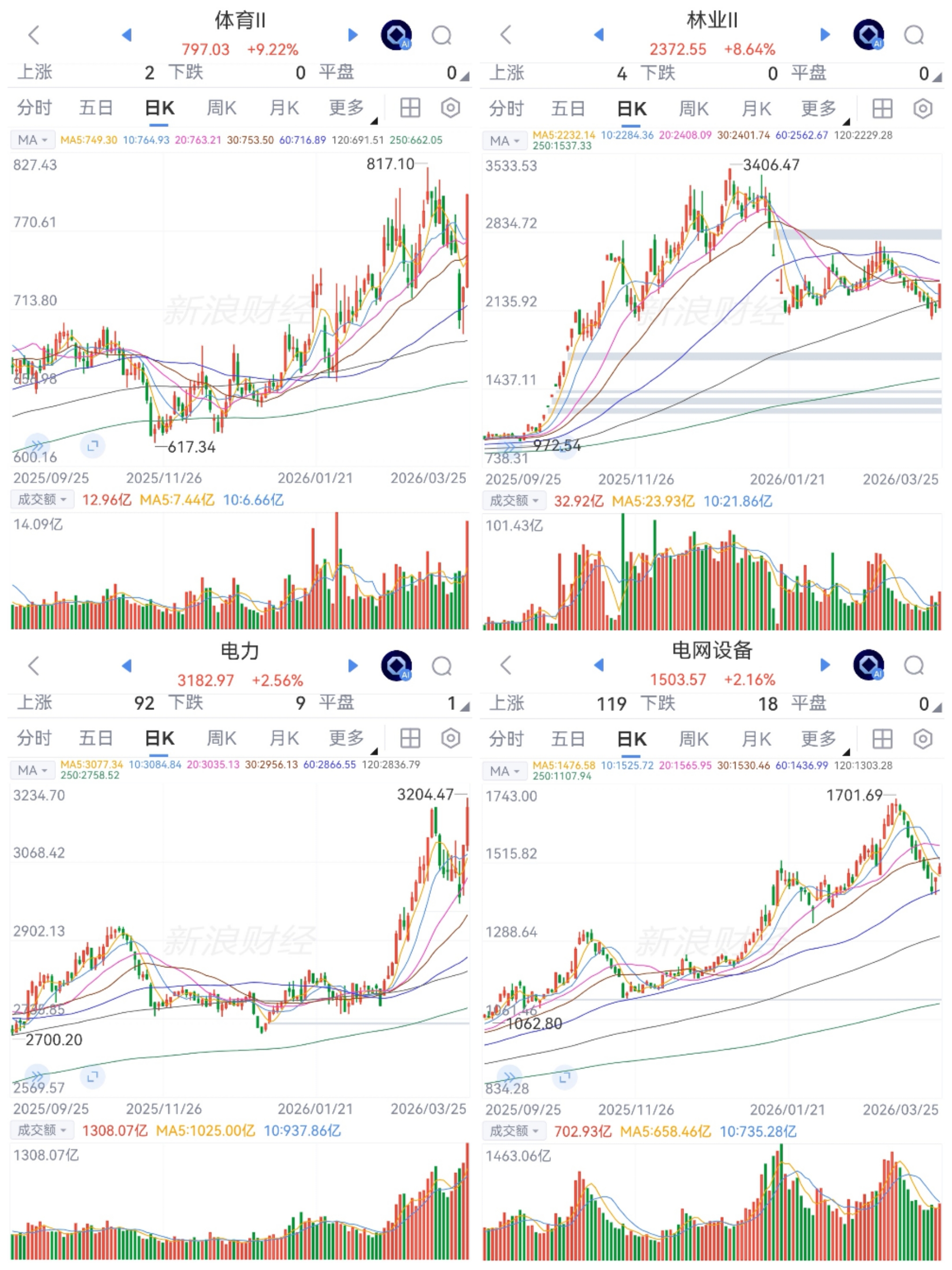 海西、体育和电力暴走。体育开盘直线拉升;林业早盘高位震荡,午后中段过后放量直线拉升;林业体育收盘9个百分点左右。电力开盘拉升后高位震荡全天,涨幅也可观,个股强势远胜板块。海西多日调整后大幅走强,算电结合,电力即是算力。