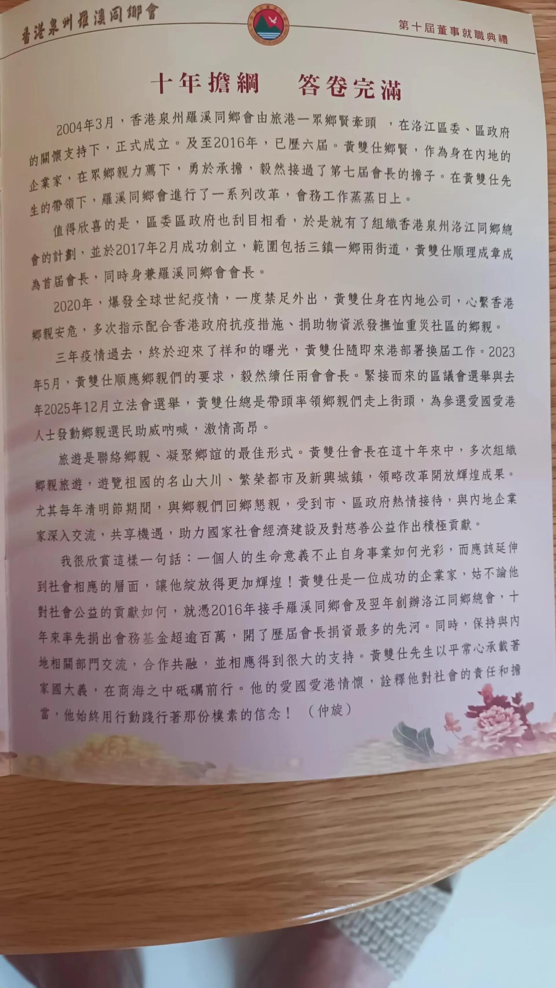 《十年担纲 答卷完满》,仲旋写两届会长黄双仕先生