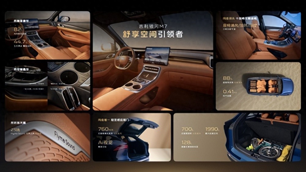 银河M7的舒享体验,做到了同级全方位领先,从空间、静谧性到座椅体验,每一处都紧扣家用出行的核心需求。依托GEA Evo架构实现空间重构,整车得房率同级领先,后备厢基础容积700L,最大可拓展至1990L,还有30处精巧储物空间,装载能力拉满;整车静谧性同级最佳,160项风噪优化措施搭配双层夹胶静音玻璃,高速行驶时也能保持车内安静;内饰用料同级更奢,大面积生态麂皮搭配生态木纹饰板与水晶组件,触手可及皆是精致,十层棉花糖座椅配备通风、加热与按摩功能,让驾乘感受更舒适,视觉识别电尾门为同级少有配置,日常使用更便捷。