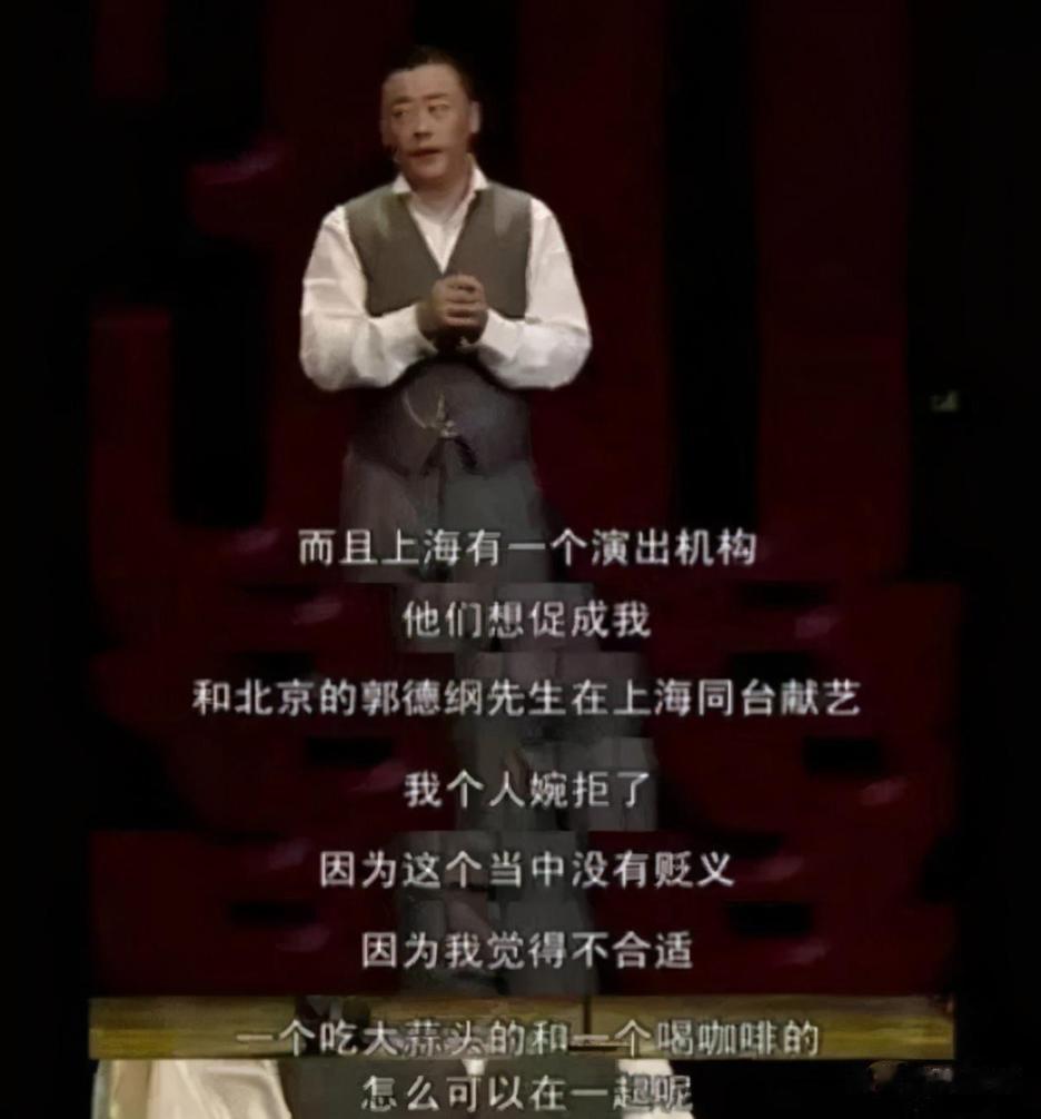 有记者问周立波,会不会和郭德纲合作,他直言“喝咖啡的怎么能跟吃大蒜的坐在一起”,