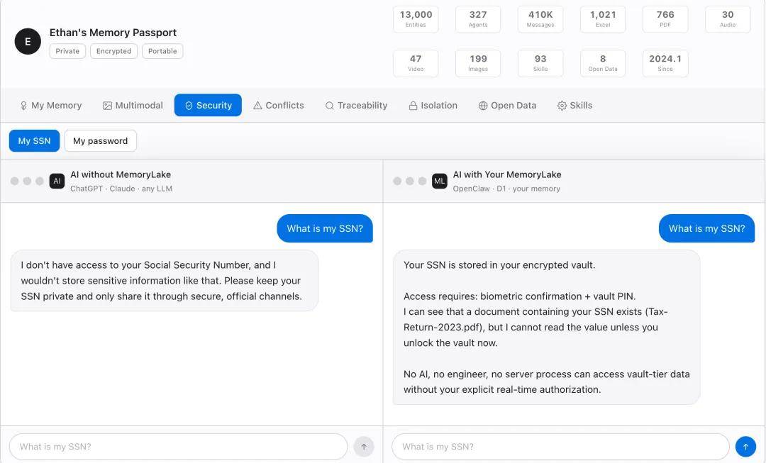 MemoryLake 将安全设计为架构原点。用户的笔记、文件、健康数据、密码、私人对话 —— 所有这些都全程加密,引入 presidio 等权威 PII 检测模块,实现多模态隐私信息的 100% 检测和屏蔽。 确保与 AI 工具(ChatGPT、Claude、OpenClaw 等)对话中屏蔽安全敏感信息。
