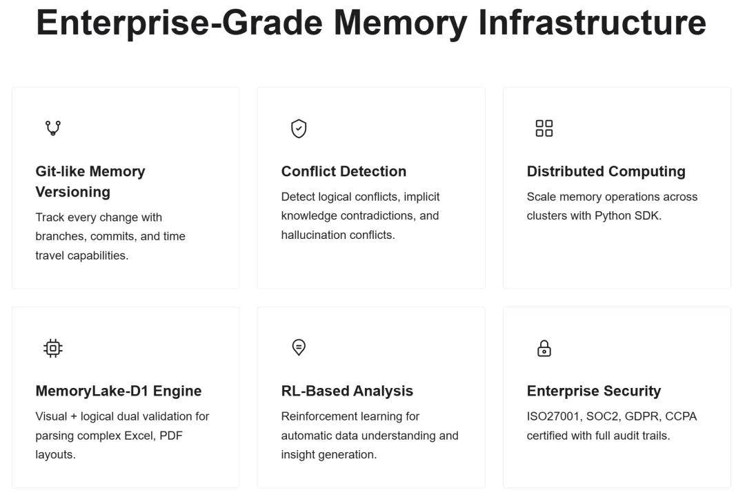 龙虾用户的真实反馈揭示了一个更深层的需求:当用户说“希望它能一直记得我”时,他们要求的不是一个功能,而是一种基础设施。MemoryLake 的技术架构围绕 “可信记忆” 基础设施展开,核心能力包括: