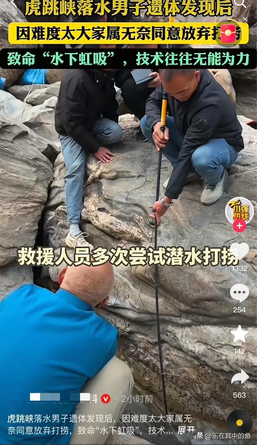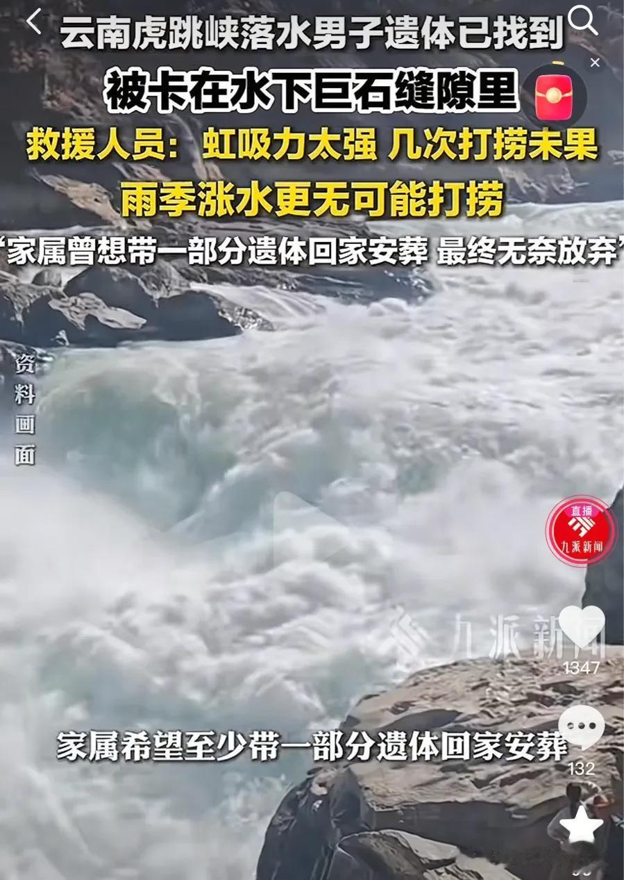 最近,事情又有了新的进展,但也带来了更让人心碎的消息,男子的遗体已经被找到,但由于打捞难度实在太大,家属经过再三考虑,最后只能含泪放弃打捞。