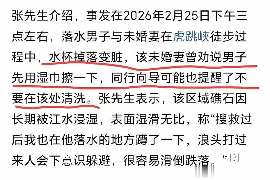 事发当天,男子和女友一同前往虎跳峡景区游玩,他的保温杯上沾了点泥,便想蹲在江边的礁石上洗一下杯子。