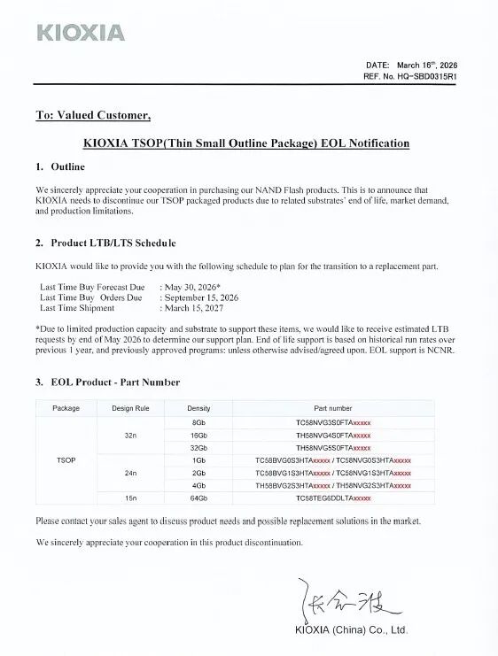 铠侠表示,由于生产能力和基材限制,公司无法生产8Gb-64Gb的TSOP封装产品。希望收到最后采购预测(即客户最后一次下单数量)期限为2026年5月30日,以确定铠侠的支持计划。最后采购订单截止日为2026年9月15日,最后出货时间为2027年3月15日。