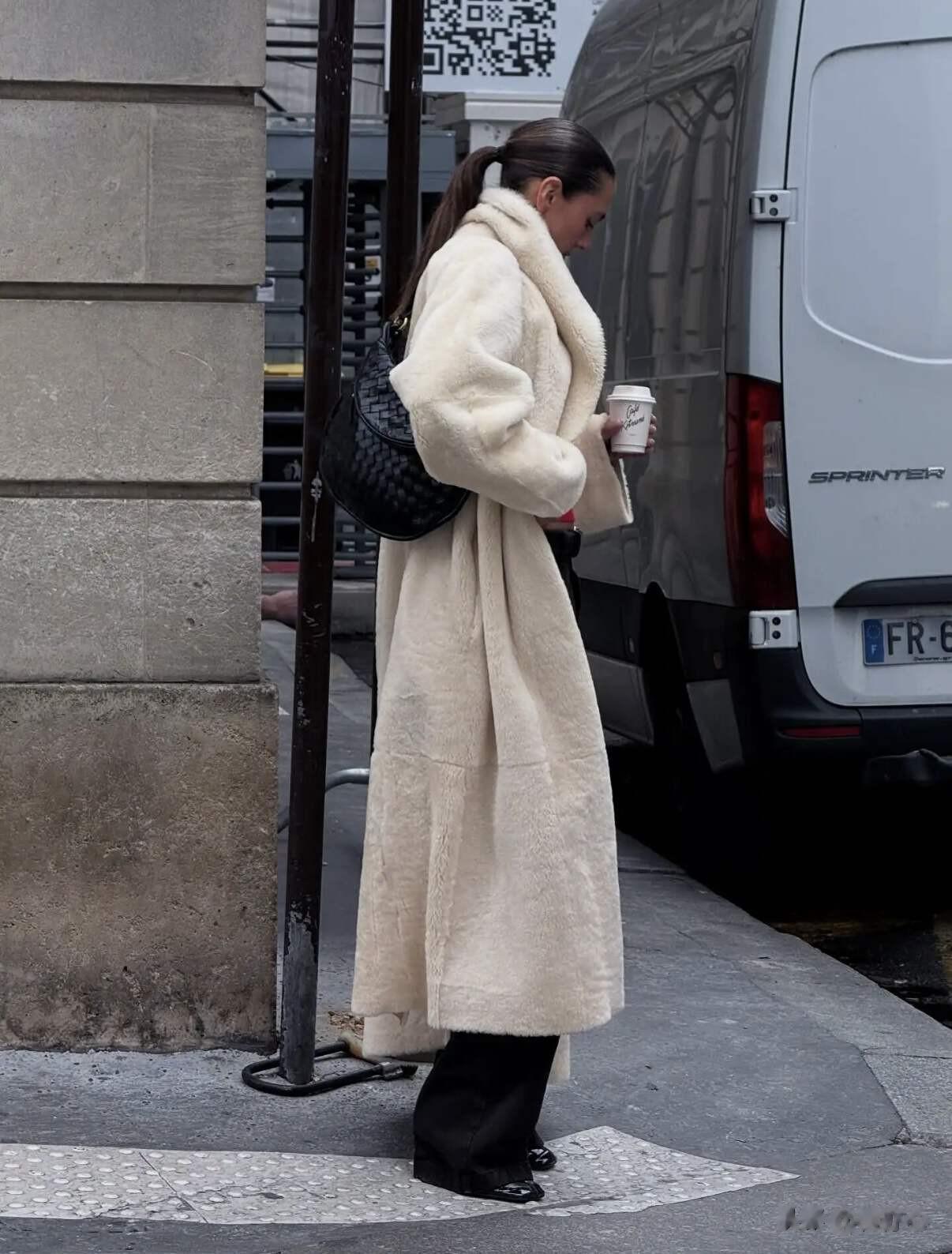 中长款“皮草”刚好可以遮住臀部,可以修饰梨形身材,又比长款轻盈,怎么搭都好看。