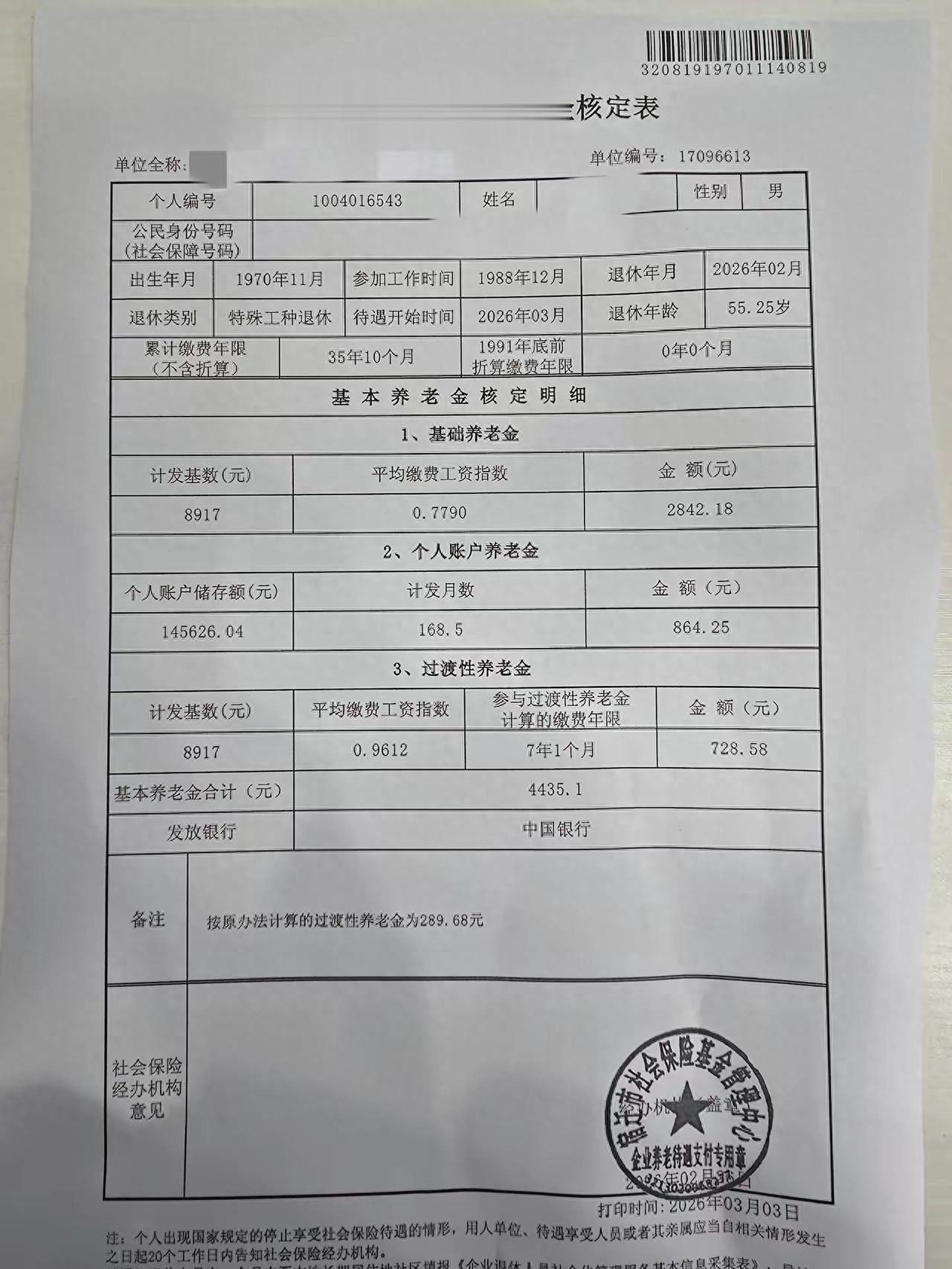 这是一张江苏退休人员养老金核定表。这位友友88年12月参加工作,2026年2月55.25岁退休,累计缴费年限达到了35.
