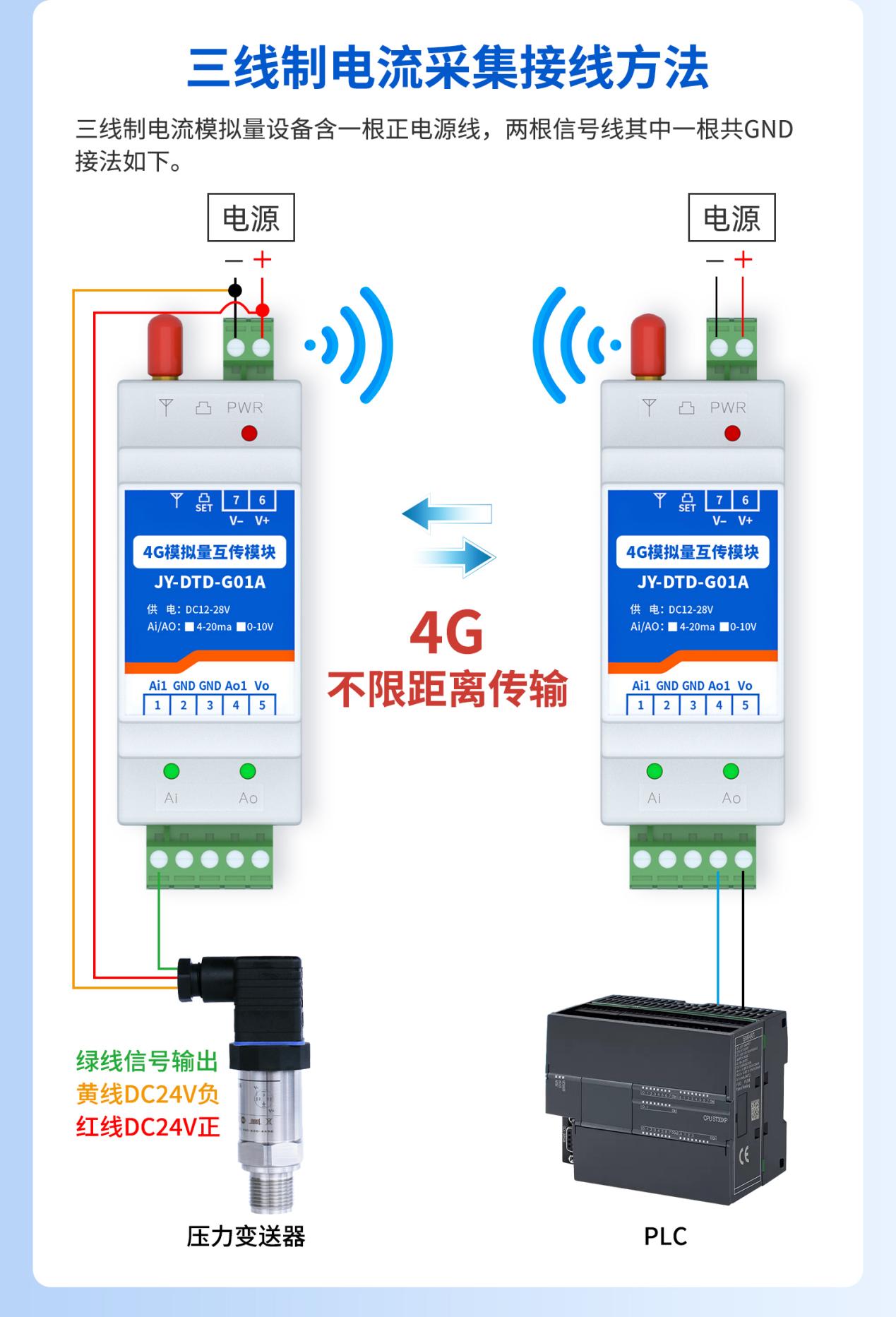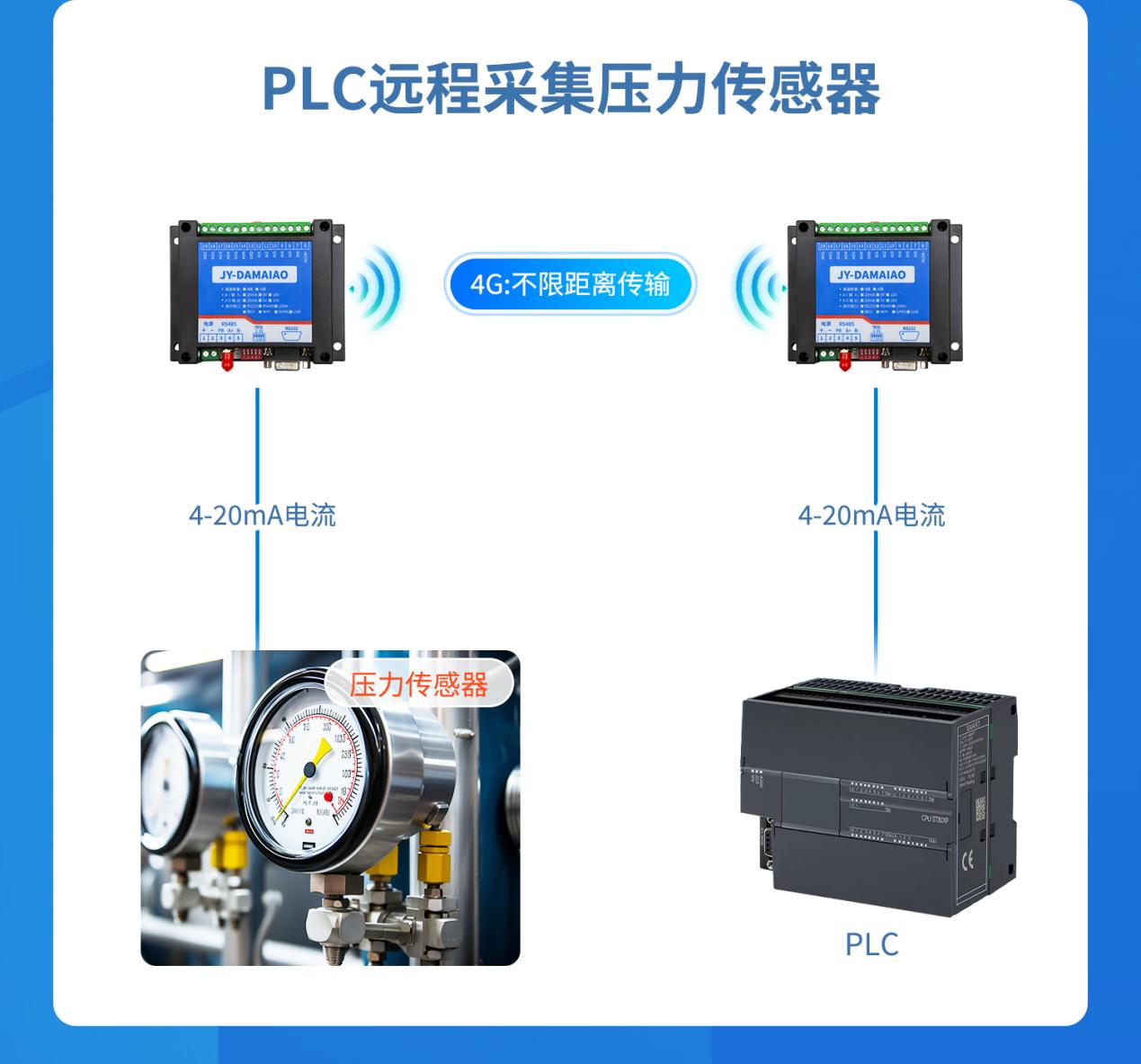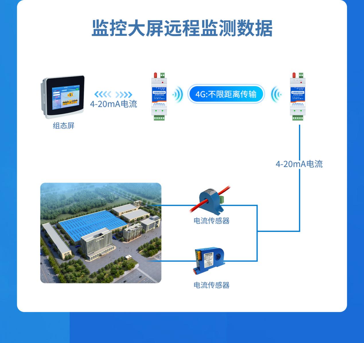 野外、厂区、管网等不便布线场景,将传感器(压力、液位、温度、流量、湿度等)4‑20mA 信号,通过 4G 无线上传至监控室、PLC 或云平台,实现远程实时监测。